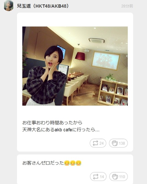 0 Response to "【悲報】HKT48・兒玉遥、AKBカフェに行くも客が一人もいなかったw【HKT48】"
